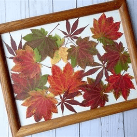 누른 단풍잎들을 유리 또는 아크릴 프레임에 배열하여 만든 벽 장식용 아트입니다. 자연의 색채를 긴 시간 간직할 수 있는 대표적인 계절 작품입니다.